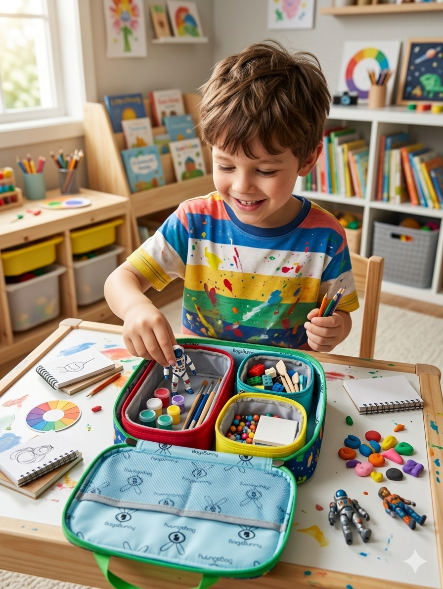Coco Play Kit – A smart, multi-purpose organizer for kids with 3 handy pouches plus one Main Bag to neatly store toys, art supplies, snacks, and daily essentials. Pack of 4 . Designed for easy carrying and playful organization—perfect for travel, playtime, and everyday use.
