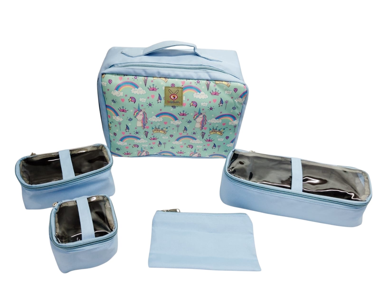 Keep your beauty essentials perfectly organized with this vibrant cosmetic pouch .. Compact yet spacious, it comes with 3 removable pouches with transprent lid. And a small flat pouch for makeup brushes. Sturdy zippers, and a convenient carry handle — ideal for travel, daily use, and clutter-free storage in style.