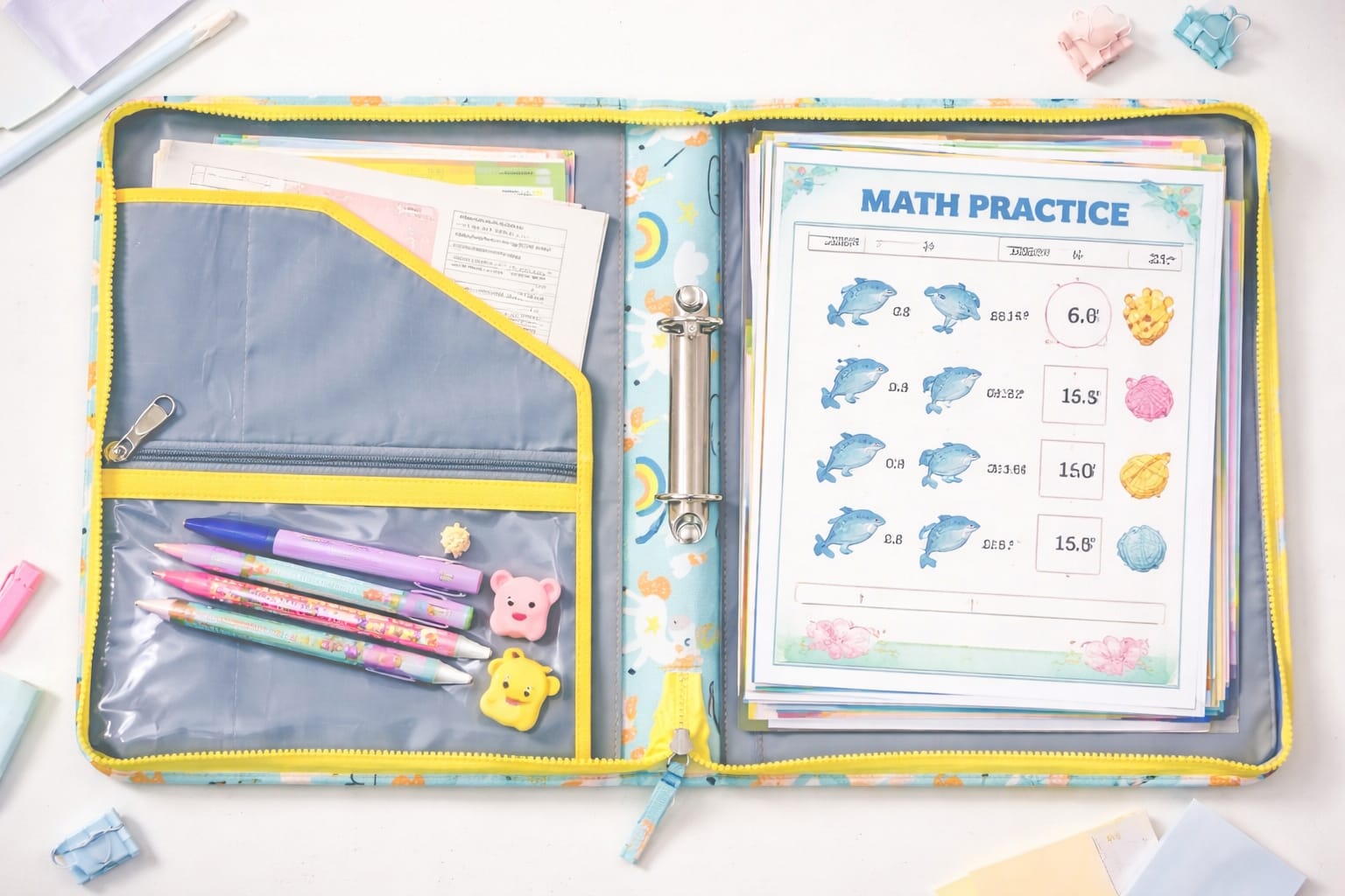 A spacious, zip-around folder with built-in ring binder, transparent sleeves, and multiple pockets to neatly store certificates, worksheets, and important documents. Includes zip pockets for pens and stationery, keeping everything organized in one place—perfect for school, travel, and everyday use.