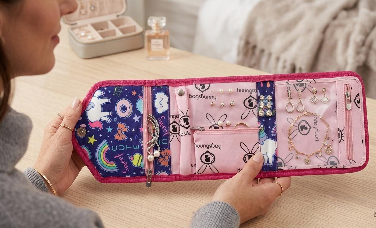 Designed with dedicated earring holders, ring straps, and small zipper pockets, it ensures your jewellery stays organized, secure, and tangle-free. Necklaces remain neatly in place without knots, while the compact design easily fits into your bag.