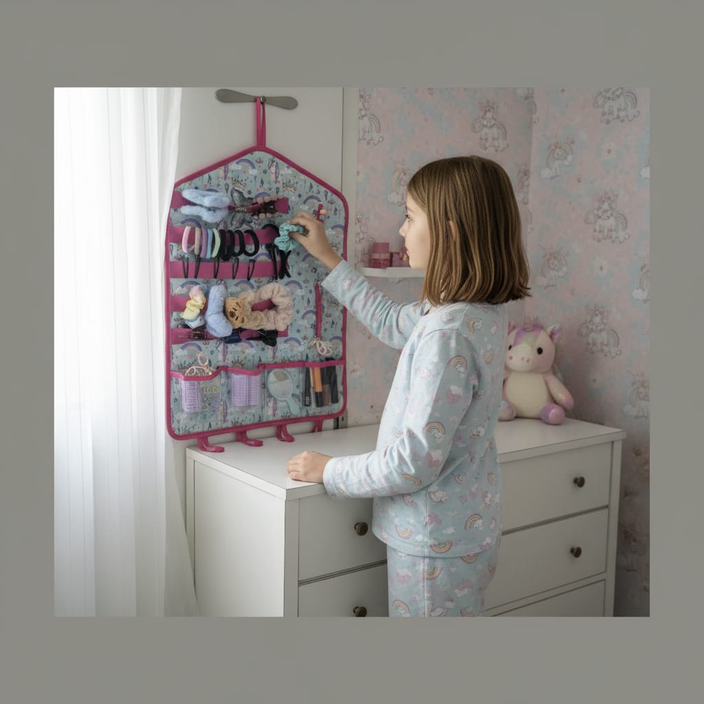 Keep your hair essentials neat and easy to find with Bags Bunny’s Hanging Hair Accessories Organizer. Designed with hooks and loops to hold clips, rubber bands, scrunchies, and pins, plus 4 spacious pockets for combs and other accessories — it’s the perfect blend of style and convenience for your dressing