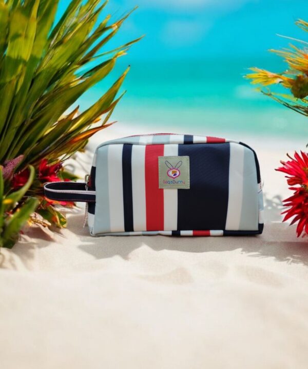 Stay organized in style with this stripe-print pouch featuring two spacious zip compartments, a wipeable inner lining, and a handy side loop. Perfect for travel, cosmetics, or daily essentials—compact, cute, and functional!