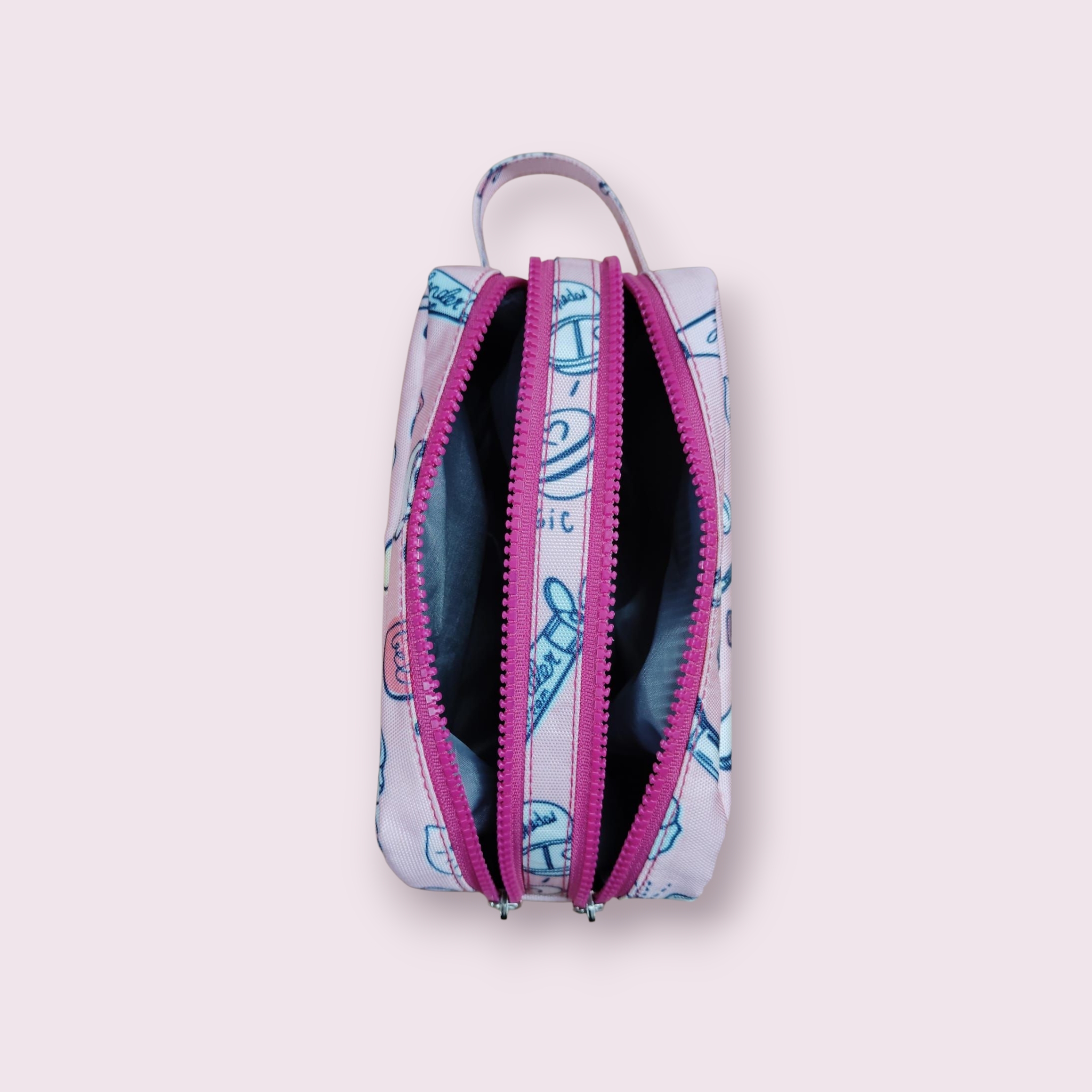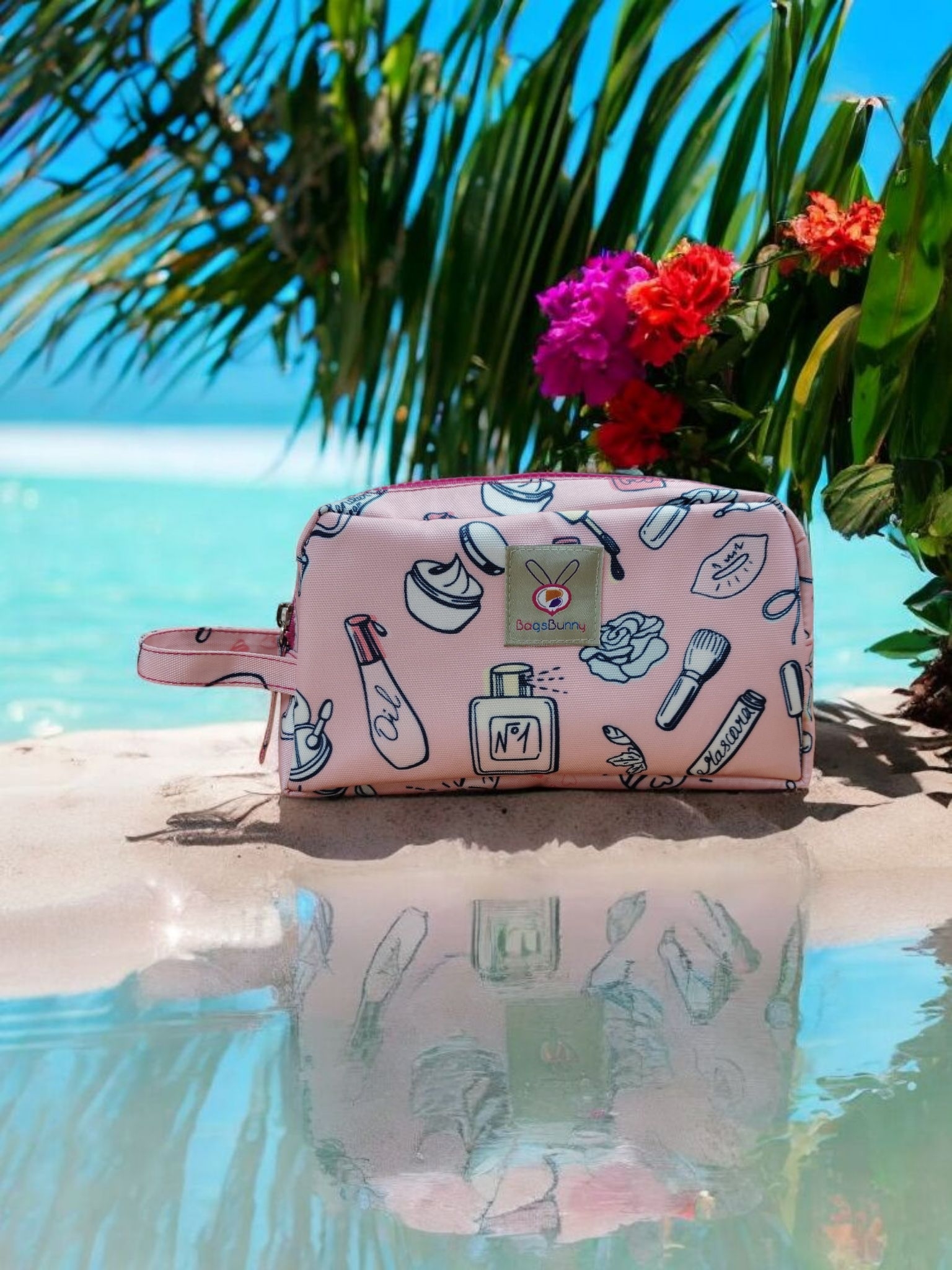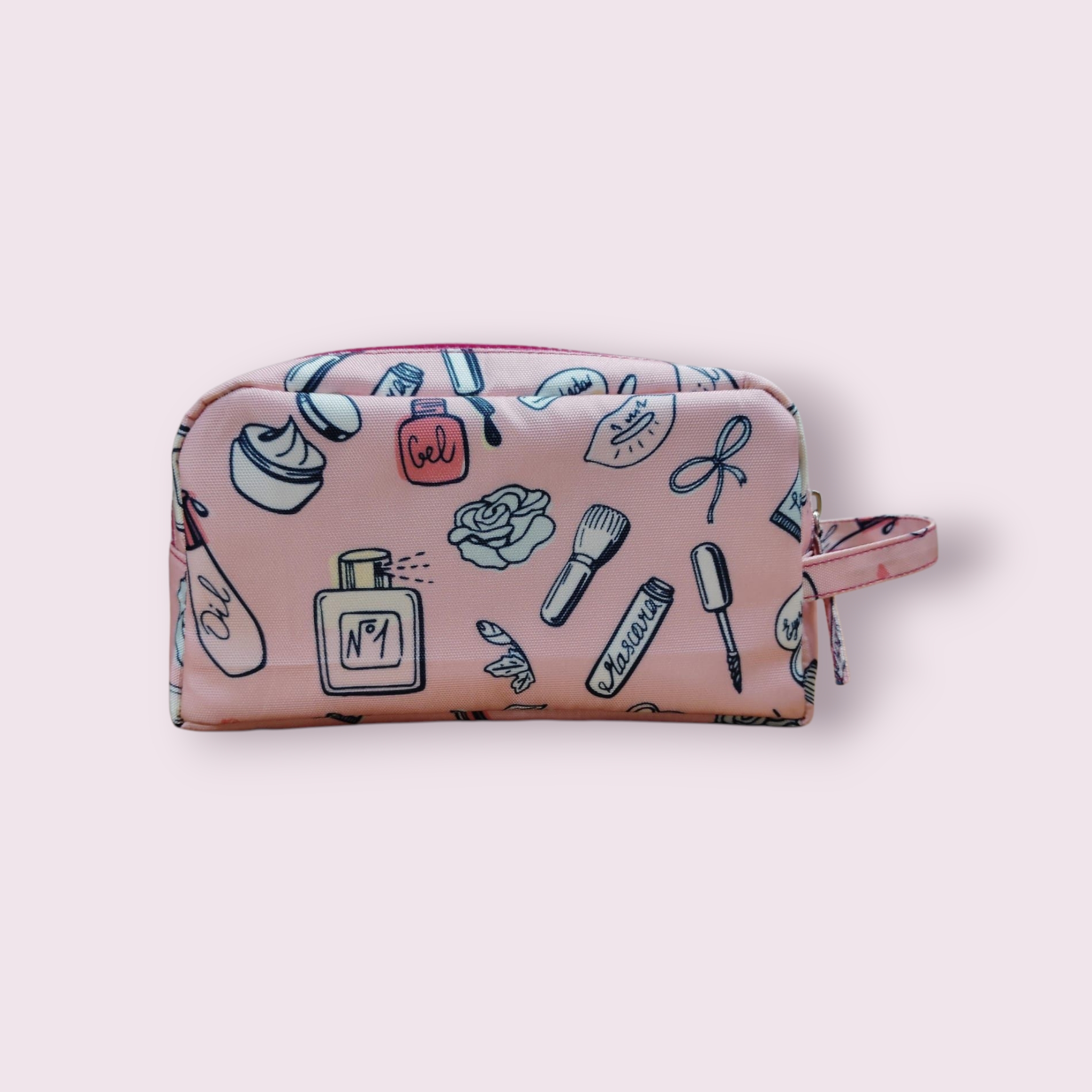 Stay organized in style with this makeup-print pouch featuring two spacious zip compartments, a wipeable inner lining, and a handy side loop. Perfect for travel, cosmetics, or daily essentials—compact, cute, and functional!