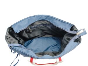 Classic Navy Everyday Tote A smart, spacious tote crafted in durable fabric with bold red-white striped handles for a stylish pop. Lightweight yet sturdy, it comfortably fits your daily essentials — from work files to travel must-haves. The secure zip closure keeps everything safe while the structured shape makes it perfect for office, café runs,…